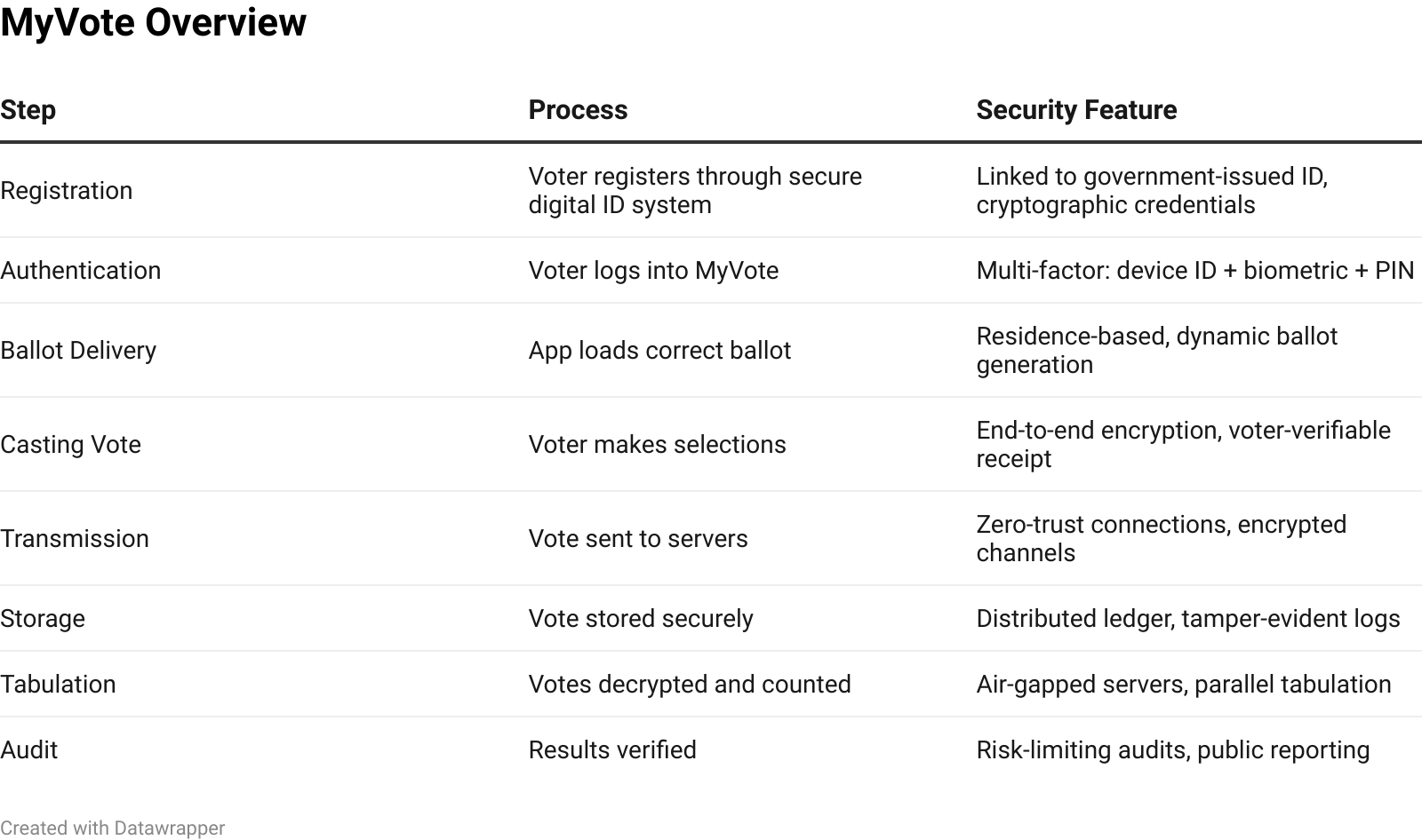 • Open-source code: The MyVote software would be published for public review. Anyone could inspect it for flaws or backdoors.