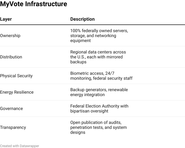 Security is not only about encryption and software. It also depends on the physical and organizational systems that support the technology. If servers are privately owned or concentrated in one location, they become single points of failure. To prevent this, MyVote would rely on federally owned, regionally distributed infrastructure. This ensures that no private company controls the backbone of American elections and that no single outage could disrupt voting.