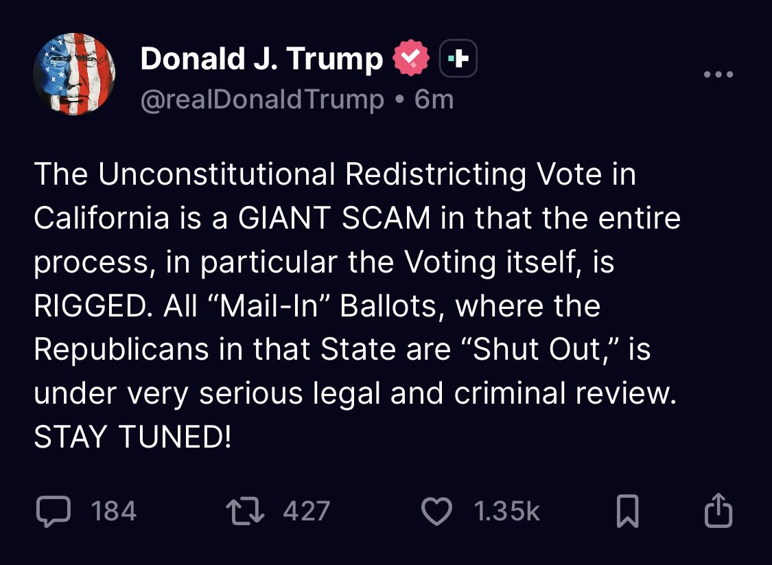 More than seven million Californians had already voted by midday, including 4.6 million by mail. Trump’s meltdown here is about power. Prop 50 could net Democrats up to five House seats, threatening his razor‑thin majority. His lies about mail voting are recycled from 2020, and they are just as false now as they were then.